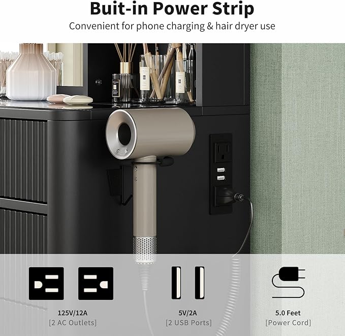 - Come with Power Outlet: This vanity is equipped with a charging station and hair dryer holder, including 2 standard plug sockets and 2 USB ports. Effortlessly connect your hair dryers, curling irons, and charge your devices like phones and tablets, ensuring you're always ready to capture stunning selfies after your beauty routine