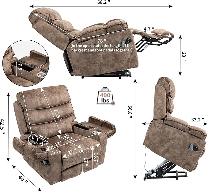 - 【Power Lift Function for Easy Assistance】This extra wide recliner includes a lift function to assist you in standing up or sitting down with ease, making it ideal for elderly or who need extra support. The smooth and reliable lift mechanism ensures convenience and ease of use.