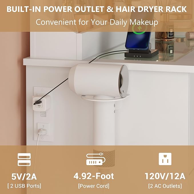- 【Multi-Functional】This vanity desk with mirror and lights that have 3 different color modes: warm yellow, warm white and cold white, you can adjust the light with different lighting conditions, help you create a suitable atmosphere to makeup perfectly. The side of the vanity desk install a hair dryer rack and a power outlet, the power outlet including 2 AC outlets and 2 USB charging ports, very convenient for you to charge phone or beauty power tools such as hair dryer, curling iron.