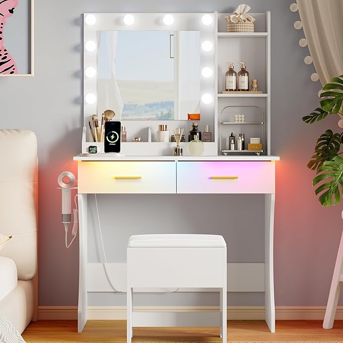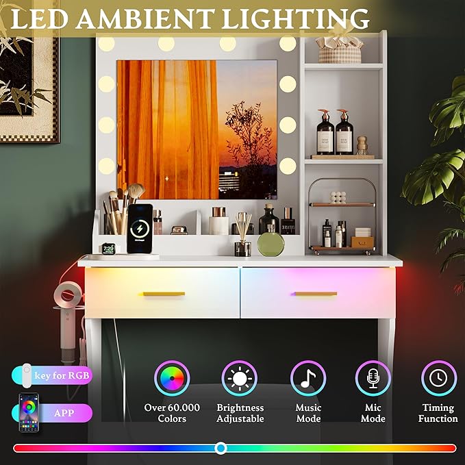 - 【Smart RGB Ambient Light】The vanity desk with mirror and lights equipped with an RGB lighting system under the tabletop, which can be controlled by mobile app or button. There are more than 60,000 static light colors, multiple dynamic light modes, music mode, microphone mode and timing function. The music mode allows the LED lights to flash to the rhythm of music. Bring you a great visual feast
