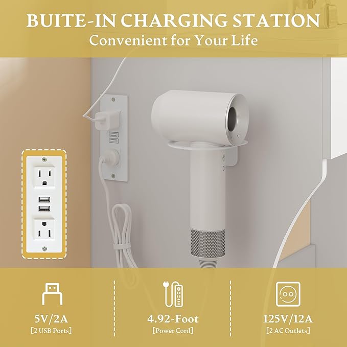 - 【Convenient Charging Station & Hair Dryer Rack】The dressing table comes with a power strip, including 2 AC outlets and 2 USB ports, through which you can charge and use electronic devices simultaneously without searching for available outlets. In addition, our kids/girls vanity provides you with a hair dryer rack to keep your styling tools are always within reach