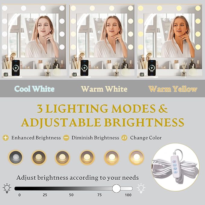 - 【3 Lighting Modes & Brightness Adjustable】The makeup vanity is equipped with a mirror. Surrounding the mirror, there are 10 Hollywood bulbs, providing 3 lighting modes: warm yellow, warm white and cool white, the brightness is adjustable according to your different makeup needs, perfect for home makeup, salon, and live broadcast. So you can experience the star-like makeup treatment
