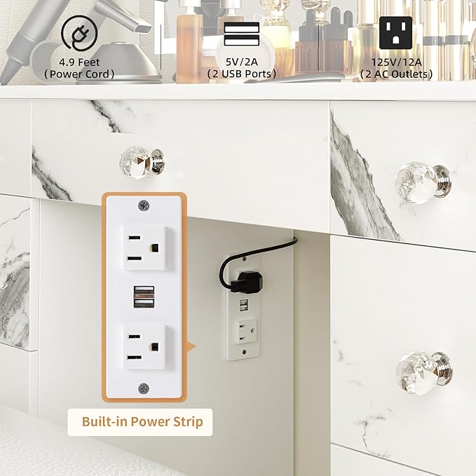 - Convenient Charging Station: Equipped with 2 standard plug sockets and 2 USB ports, this makeup desk allows for easy charging of hair dryers, curling irons, beauty devices, and phones.