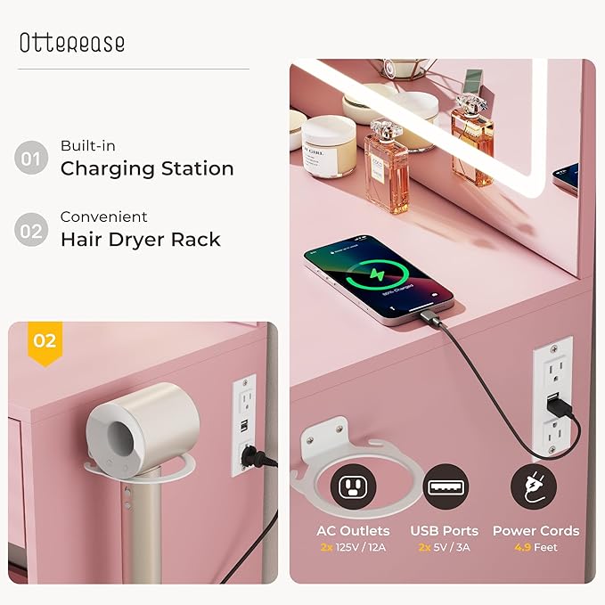 - 【Unique Functional Design】This vanity features a built-in hairdryer holder for easy access, along with a charging station equipped with 2 standard power outlets and 2 USB ports—allowing you to effortlessly use styling tools like hairdryers or curling irons while charging your mobile devices.