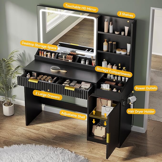 - Ample Storage Space: From your go-to lipstick to bulky hair tools, everything finds its place. With 2 drawers, 1 adjustable-shelf cabinet, 5 open compartments & 3 open shelves to show off or stash away, your makeup vanity stays clean, stylish, and always ready when you are