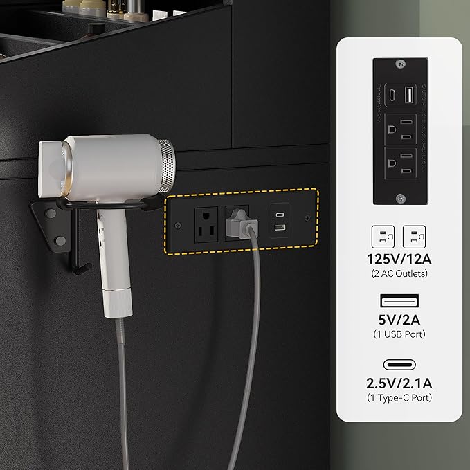 - Easy Charing & Hairdryer Holder: Built-in 2 AC outlets, USB, and Type-C ports let you plug in your devices with ease, while the clever hairdryer holder of black vanity desk keeps your tools off the tabletop and always within reach when you’re styling on the fly