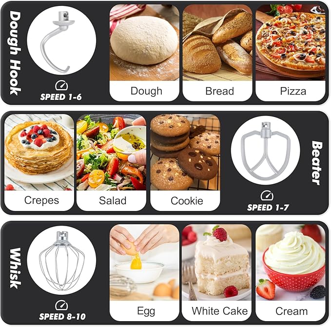 - 【Durable Attachments & Dishwasher Safe】As a versatile food mixer it includes coated aluminum dough hooks & beaters, plus a stainless steel whisk for lasting performance. All attachments snap on and off in seconds for quick changes during baking. The stainless steel bowl and all attachments are dishwasher safe (top rack recommended), ensuring quick and hassle-free cleanup.