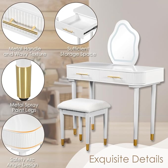 - 【Arc Edge and Metal Handles】This vanity table boasts elegant metal handles, stylish wave-patterned drawers, and an eye-catching mix of white legs paired with gold-tipped feet, adding a modern touch to your room. The legs are equipped with anti-skid pads to protect your floors from scratches and reduce noise when moved, effortlessly combining functionality with elegance.