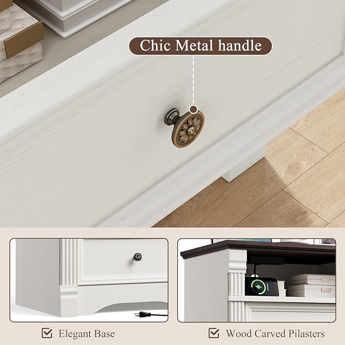 Yaamizz Farmhouse Nightstands with Charging Station, Table with Drawer and Storage Shelf, Wood Pilasters and Metal Handles, Vintage Design, Organizer for Bedroom, Hallway, White