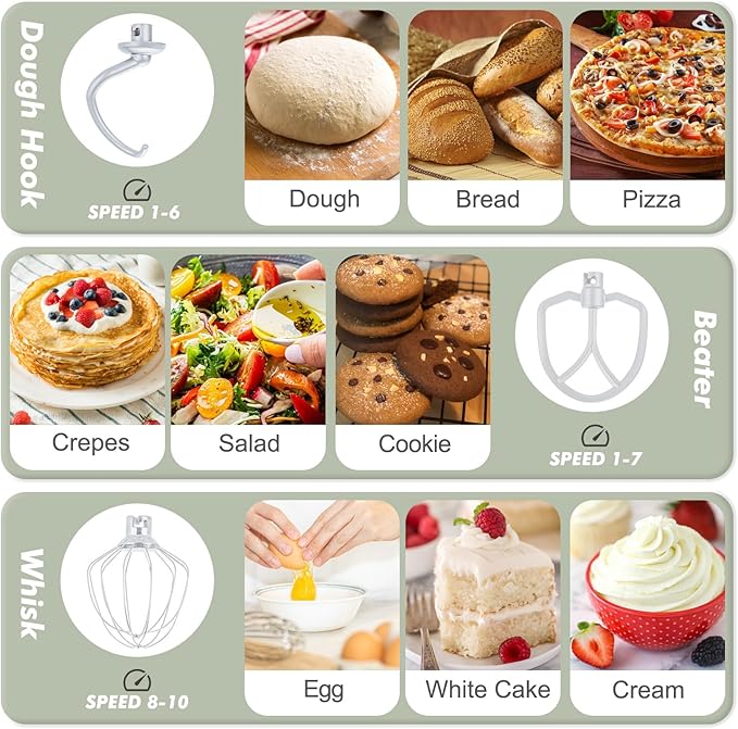 - 【Durable Attachments & Dishwasher Safe】As a versatile food mixer it includes coated aluminum dough hooks & beaters, plus a stainless steel whisk for lasting performance. All attachments snap on and off in seconds for quick changes during baking. The stainless steel bowl and all attachments are dishwasher safe (top rack recommended), ensuring quick and hassle-free cleanup.