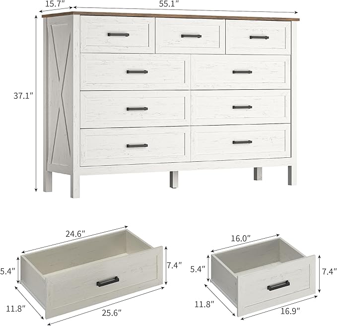 Farmhouse 9 Drawers Dresser for Bedroom, 37 Inch Tall Wood Rustic Wide Chest with Natural Texture, Large Dressers for Bedroom, Hallway, Entryway, Antique White