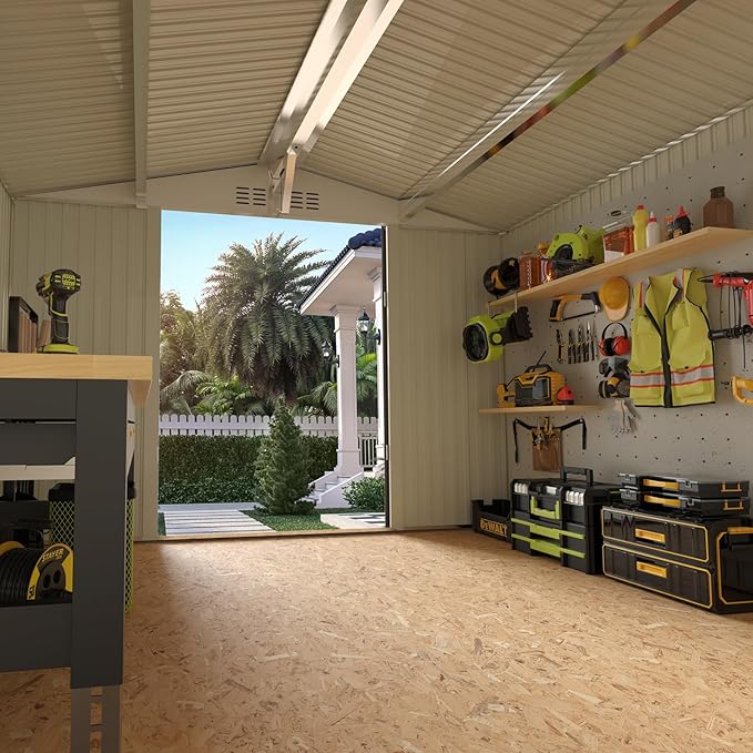 - 【Safe and Durable】 3 beam roof will not fall down in wind and snow, sturdy and durable. Metal garden storage shed adopts electro galvanized steel process and paint treatment, suitable for all kinds of climate, no need to worry about metal rust.Backyard shed will not be deformed due to sunlight irradiation, the vents effectively promote air circulation, moisture-proof performance is excellent.