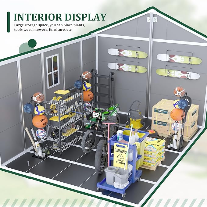- đ ăSpacious & Versatile Outdoor StorageăThis generously sized outdoor storage shed comfortably accommodates lawn mowers, bicycles, gardening tools, and storage racks, decluttering backyard, patio, or lawn areas. Its adaptable design transitions seamlessly between practical storage and secondary roles like a ventilated pet house or sunlit greenhouse, maximizing your outdoor utility