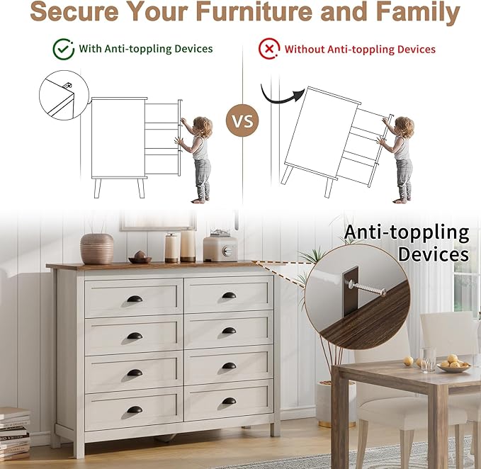 - 【Spacious 8 Drawer Storage】Equipped with 8 generously sized drawers, our dresser for bedroom provides ample room to organize clothing, accessories, or household items. The layout is ideal for categorizing daily essentials or seasonal wardrobe changes.