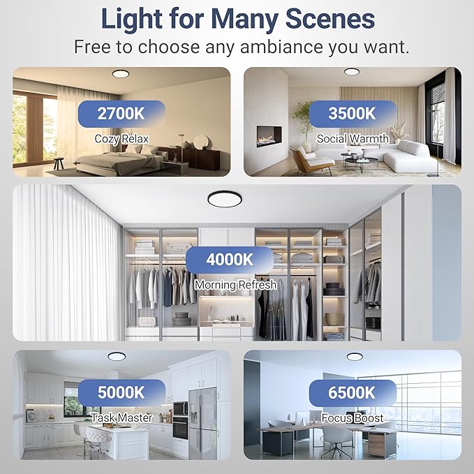 - 【5CCT Customization for Versatile Ambiance】Switch seamlessly between 2700K-6500K color temperatures (warm to daylight) in one fixture—no multiple purchases needed. Perfectly adapt lighting for kitchens (bright 5000K), cozy bedrooms (2700K), or task-focused living room (4000K), eliminating compatibility hassles.