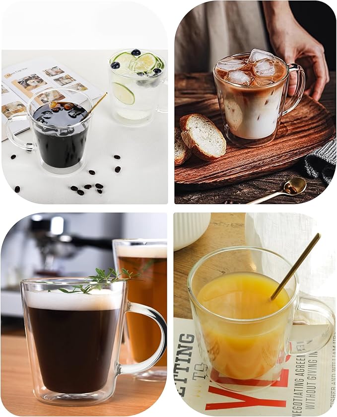 - ☕EASY TO HOLD - The coffee glasses are lightweight, the handles are a perfect size, and do not cause discomfort to hold. It is very easy to use for enjoying Latte, Cappuccino, Espresso, tea, beer, juice, ice cream, and other hot or cold beverages.