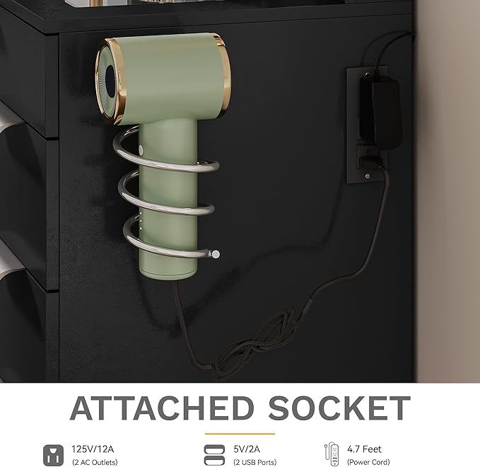 - Integrated Power Hub: This vanity table features 2 AC sockets, 1 USB, and 1 Type-C port, plus a built-in hair dryer rack. Keep your phone, curling iron, and styling tools charged and within easy reach while you get ready