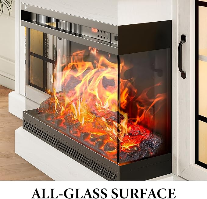 - Stylish 3-Sided Glass Design: Fireplace TV stand is designed to offer a wide view of the fire from three sides. This creates a stunning visual effect. Featuring 5 settings for flame brightness, 12 colors of backlight and 12 LED colors of light strips