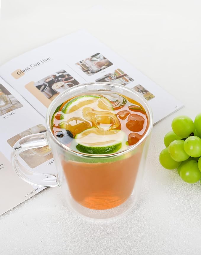 - ☕FOOD-GRADE BOROSILICATE GLASS - The clear coffee cups 350ml is made of heat and condensation-resistant borosilicate glass, accept temperature from -30℃ - 150℃, and are very robust than other normal glass mugs. Lead-Free and BPA-Free. Dishwasher safe