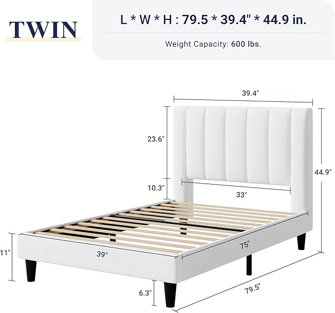 Allewie Twin Bed Frame/Velvet Upholstered Bed Frame with Vertical Channel Tufted Headboard/Strong Wooden Slats/Platform Bed Frame/Mattress Foundation/Box Spring Optional/Easy Assembly/White