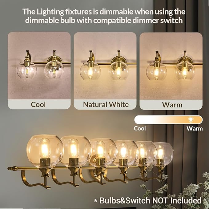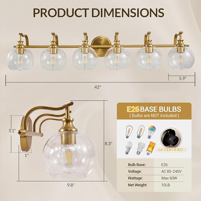 - Modern Gold 6 - Globe Statement Design: This gold bathroom sconce blends a hand - brushed gold metal base with high quality clear glass shade, their rounded curves provide bright light, adding a retro - modern glow, perfect for bathrooms, dressing rooms or any home decor