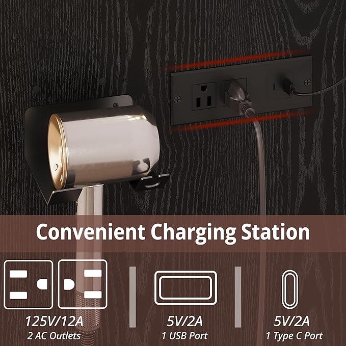 - FUNCTIONAL DRESSING TABLE: This makeup vanity has a built-in charging station on the right tabletop, including 2 AC outlets,1USB and 1Type C port, it is very easy for you to charge your electronics in time. In addition, our small vanity desk provides you with a hair dryer rack to keep your hair dryer and hair curler within arm’s reach