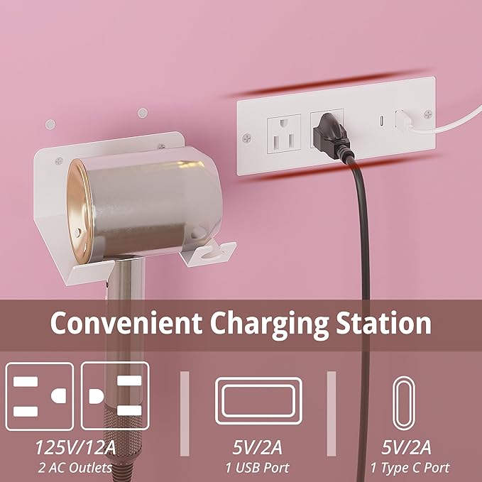 - FUNCTIONAL DRESSING TABLE: This makeup vanity has a built-in charging station on the right tabletop, including 2 AC outlets,1USB and 1Type C port, it is very easy for you to charge your electronics in time. In addition, our small vanity desk provides you with a hair dryer rack to keep your hair dryer and hair curler within arm’s reach