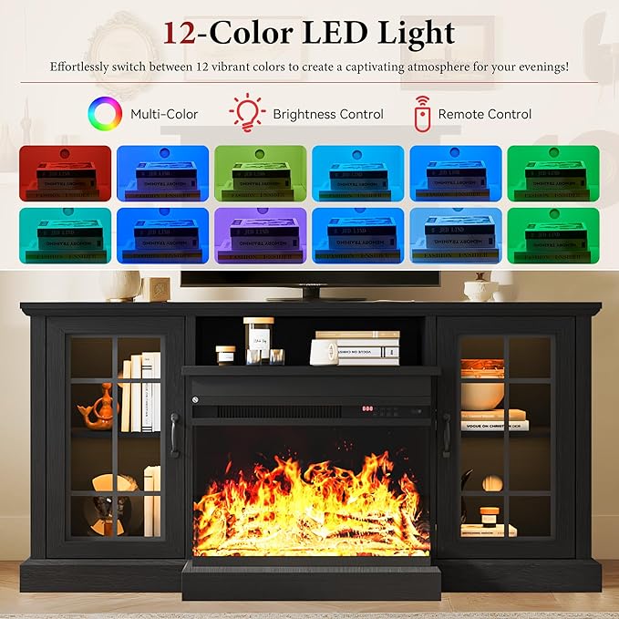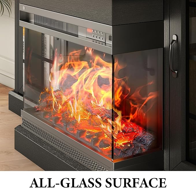 - Stylish 3-Sided Glass Design: Fireplace TV stand is designed to offer a wide view of the fire from three sides. This creates a stunning visual effect. Featuring 5 settings for flame brightness, 12 colors of backlight and 12 LED colors of light strips
