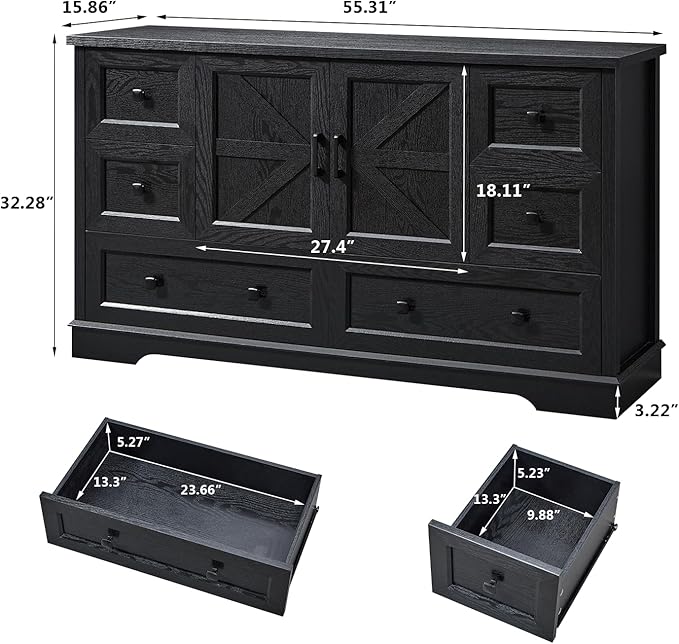 LIDYUK 6 Drawer Black Dresser for Bedroom Farmhouse Dresser Chest of Drawers, 55" Wide Clothes Organizer with Storage Cabinet Wood Chest of Drawers for Bedroom, Living Room