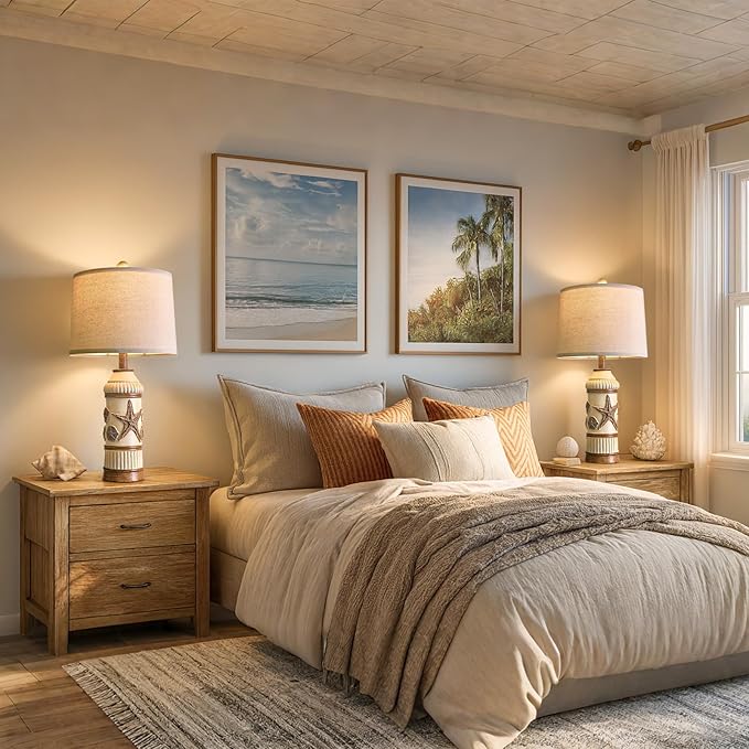 - UNIQUE COASTAL DESIGN: The unique brown and off white starfish pattern lamp body gives the table lamp a romantic atmosphere of leisure and vacation. Even though you are not at the beach, the boho table lamp can also bring you a joy of vacation .