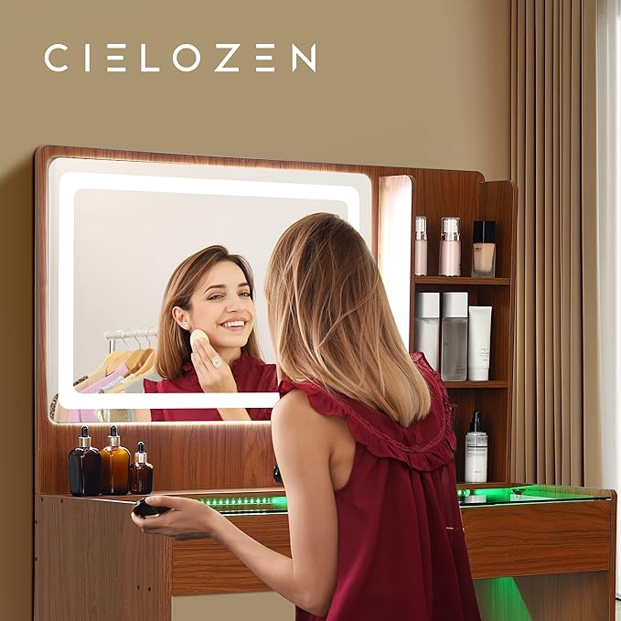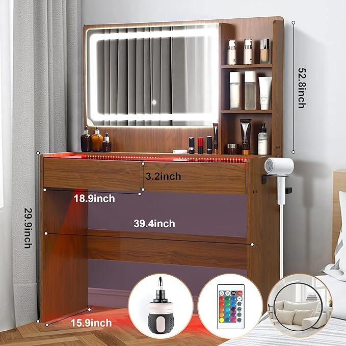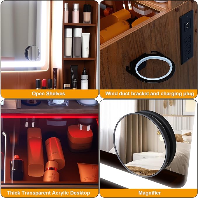 - 【Equipped with a large mirror and three color LED lights with a dressing table】The dressing table comes with a large high-definition mirror equipped with high-definition three color LED lights and a magnifying glass, allowing you to smoothly illuminate the skin of your face in different scenes, making it convenient for you to apply makeup. The lighting can be adjusted to different colors and brightness according to your needs
