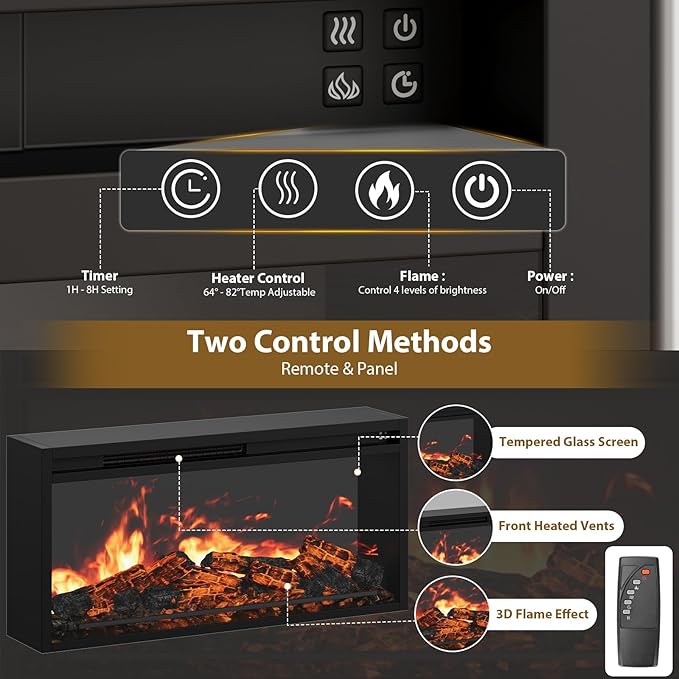 - Safety & Comfort Electric Fireplace—This 30-inch built-in electric fireplace delivers 5000 BTU/hour, efficiently heating rooms up to 450 square feet without any noise. It is equipped with an auto-timer for up to 8 hours and features overheat protection, giving you peace of mind while enjoying cozy warmth! Additionally, its realistic flame dance and burning wood effect provide visual enjoyment!
