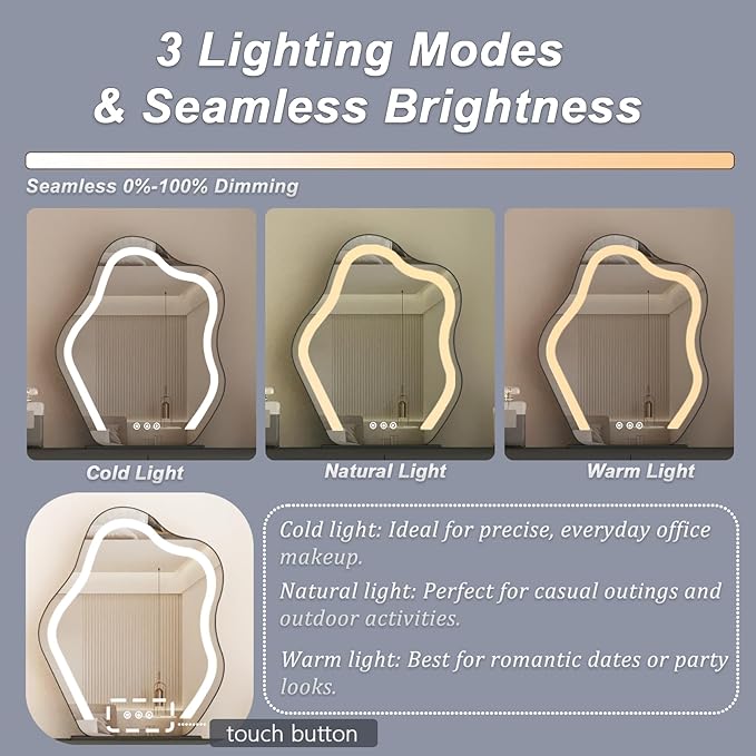 - LED Mirror with Stepless Dimming:Equipped with a high-quality LED lighted mirror, this small vanity allows for seamless dimming, so you can adjust the brightness to create the perfect lighting. Effortlessly select the ideal light setting for your makeup routine.