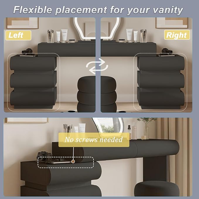 - Hassle-Free Assembly: This vanity is incredibly easy to set up—simply place the desk and side cabinet together. No screws or complicated assembly required, making it a quick and convenient addition to your space.