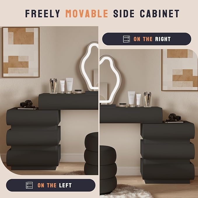 - 【Premium Materials】 - This modern vanity adopts a solid wood frame structure, silent sliding rails, and thickened panels. The high-quality materials not only eliminate any odors but also ensure they are harmless to the human body, while also increasing the overall durability.Side cabinet can be placed on the left or right according to your needs, soft PU stool makes every makeup time a pleasure and is comfortable even if you sit for a long time.