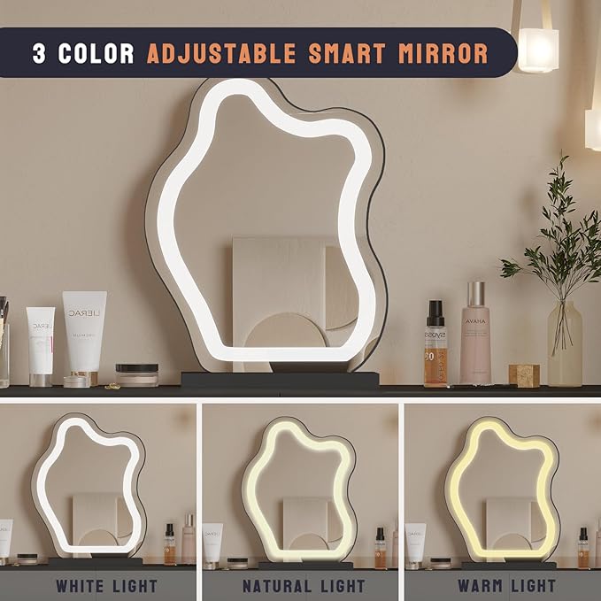 - 【LED 3-Color Cloud Makeup Mirror】 - This vanity mirror provides professional light that is bright but not glaring, and comes in 3 color modes: white light for professional workplace makeup, natural light for everyday shopping makeup, and warm light for date night and party makeup.