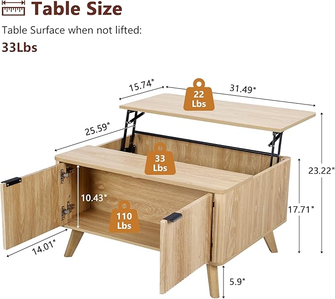 - 【Practical Lift Top Design】The coffee table experiences smooth and safe lifting with a high-quality lifting mechanism featuring gas struts. Raise the top of this coffee table from 17.71inches to 23.22 inches and make it easy to work from home, enjoy a meal, do crafts, or play games while sitting comfortably on your couch.