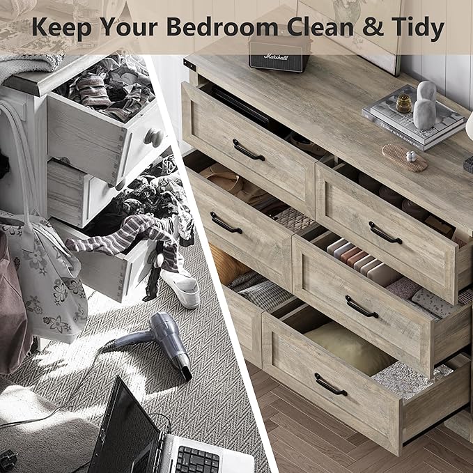 - 【Sleek & Functional 6-Drawer Wood Dresser】 This modern dresser wood combines style and practicality, offering six spacious drawers for organized storage. The wide top can hold décor or a TV up to 55 inches, making it versatile as a tv stand with storage in the bedroom, hallway, or entryway.