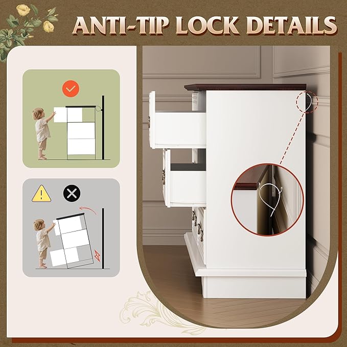 - 【Safe and Sturdy】The dressers & chests of drawers are made of durable engineered wood, featuring a thick tabletop that can support heavy items. Sloping edges and widened legs improve stability. An anti-tipping device ensures child safety by preventing wobbling and tipping.