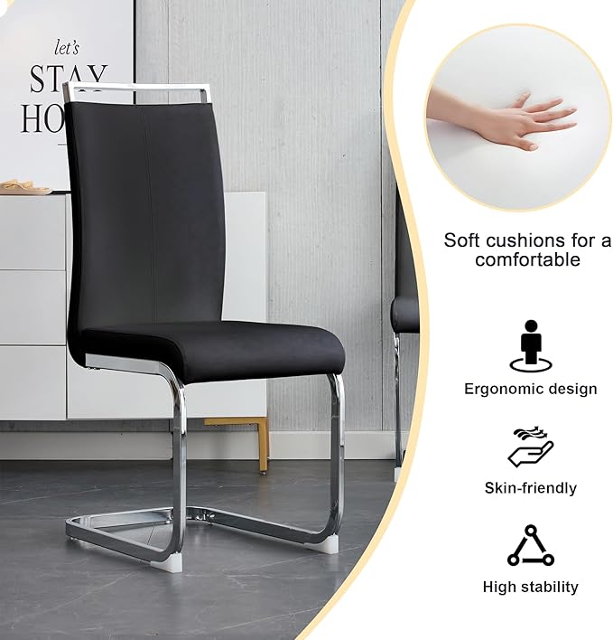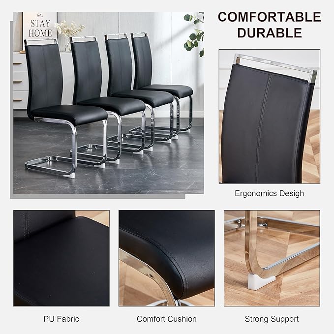 - PU Leather Chairs with High-Density Cushion:Each dining chair is upholstered in smooth PU leather with a high-density sponge cushion for ultimate comfort. The ergonomic backrest, metal frame, and non-slip foot mats ensure stable support for long meals