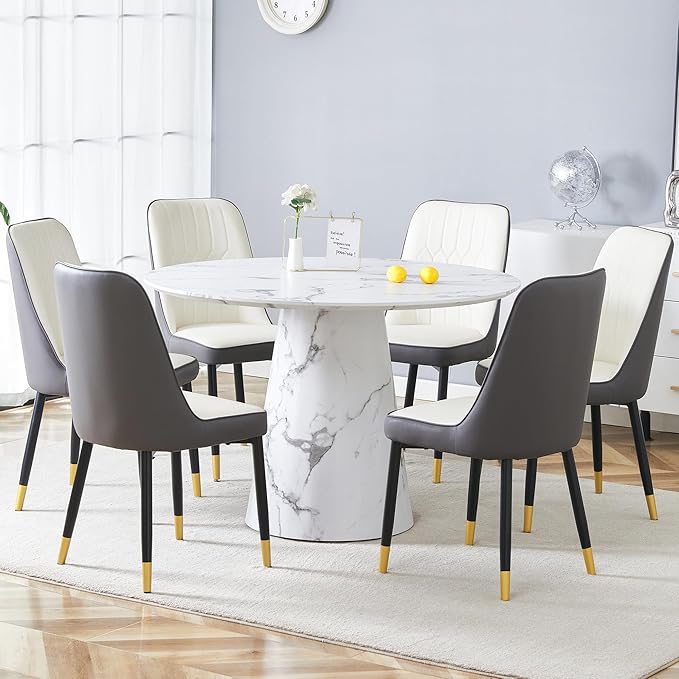 - Dining Table Set for 6:This 45 inch round dining table set for 6 features a stylish white faux marble grain finish that adds warmth and charm to any dining space. Perfect for kitchen, apartment, or small space dining room setup