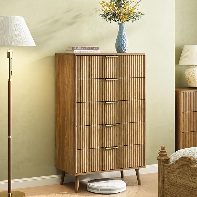 CARPETNAL Fluted 5 Double Drawers Dresser for Bedroom, 45”Tall Modern Chest of Drawers with Deep Drawers,Curved Profile Design, Wood Drawer Organizer for Living Room, Natural Oak