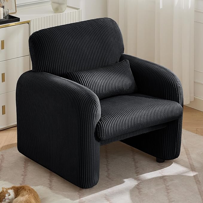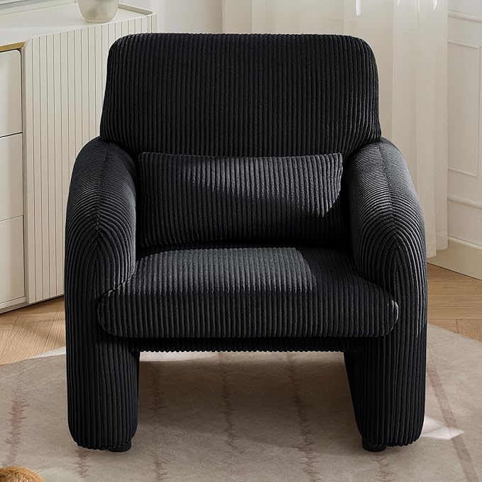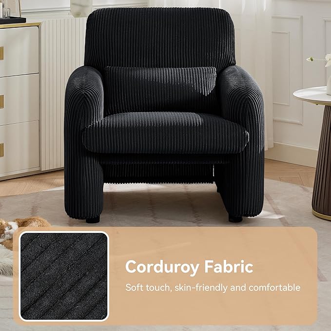 Corduroy Fabric Accent Chair, Modern Upholstered Living Room Chairs with Lumbar Pillow, Wide Comfy Leisure Armchair for Bedroom, Office, Reading, Black
