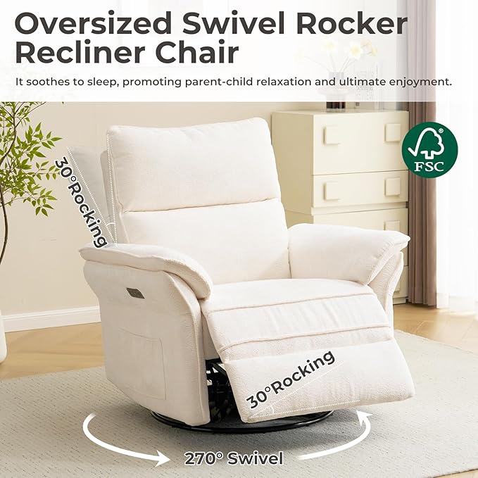 - Product Size & Multi-Functional Design: This oversized swivel rocker recliner product size is 38.5"D x 34"W x 41"H, Seat Size: 26"W x 21.5"D, Weight Capacity: 350 lbs.Additionally, the swivel recliner equipped with integrated USB and Type-C ports, it also offers modern functionality for charging devices, ensuring you stay connected while you relax.