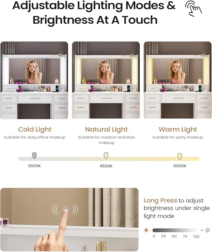 - 【Big Mirror with Lightbox】OTMCOOUCH vanity comes with big mirror and lightbox, which has warm yellow, warm white and cold white light colors. The light box is designed at an angle that allows all the light to converge on your face, rather than scattering the light in different places like other styles, which perfects for home make up, salon or live broadcast.