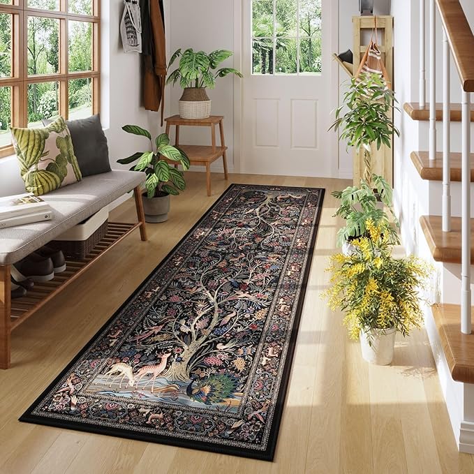 Runner Rug Vibrant Tree of Life-Patterned Vintage Kitchen Rugs Non Slip Washable Soft Carpet Runner for Laundry Bedroom Bathroom, Black