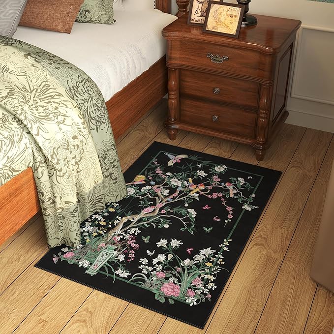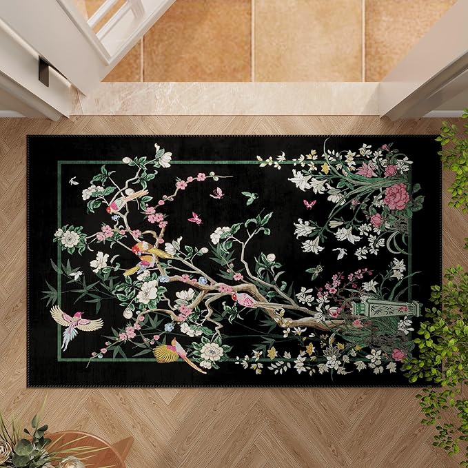 Door Mat Indoor Entrance 2x3 Rug Chinoiserie-Style Floral Vintage Machine Washable Small Area Rug Non-Slip Low Pile Throw Rugs for Entryway, Kitchen, Front Door, Entry, Kids Room, Black