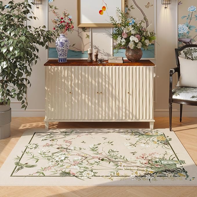 4x6 Rug Chinoiserie-Style Floral Vintage Washable Area Rugs Non Slip Low Pile Small Carpet for Bedroom, Bedside, Kids Room, Office, Dining Room, Beige