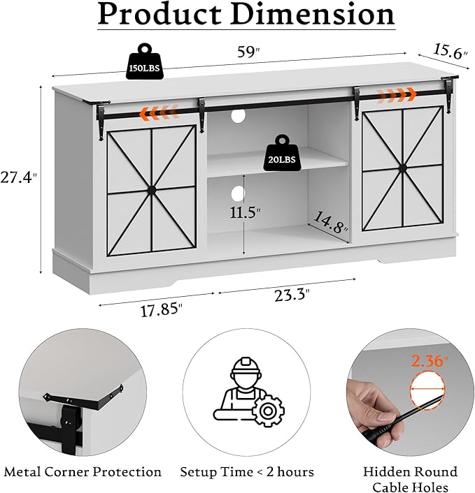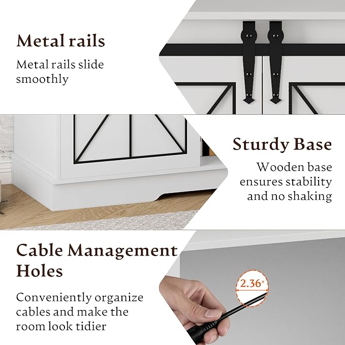 - Sliding Barn Doors &Cable Management:Durability sliding barn doors operate slide smoothly left and right on the elegant metal rails ,prevent loud slamming and pinching children hands.Hidden storage cabinets easily hide the clutter inside the TV cabinet. TV stand have built-in 2 hidden circular cable managements features to help keep wires and cables organized and out of sight, keeping your home tidy.