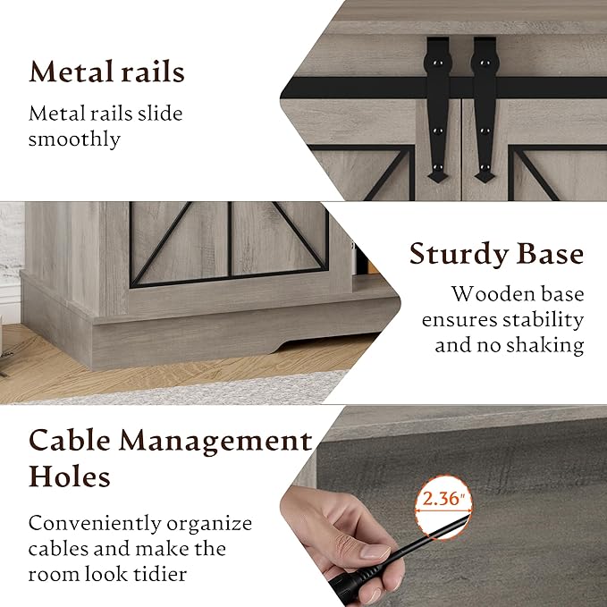 - Sliding Barn Doors &Cable Management:Durability sliding barn doors operate slide smoothly left and right on the elegant metal rails ,prevent loud slamming and pinching children hands.Hidden storage cabinets easily hide the clutter inside the TV cabinet. TV stand have built-in 2 hidden circular cable managements features to help keep wires and cables organized and out of sight, keeping your home tidy.